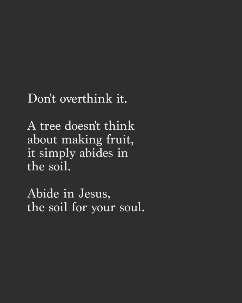 “Abide in Me, and I in you. As the branch cannot bear fruit of itself, unless it abides in the vine, neither can you, unless you abide in Me.” John 15:4 (NKJV)